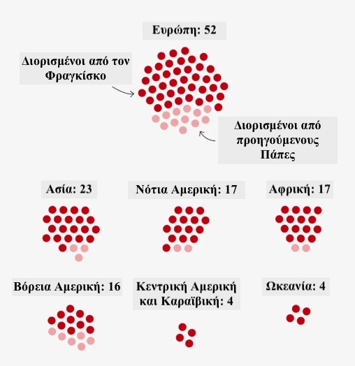 Οι καρδινάλιοι από την Ευρώπη αποτελούν τη μεγαλύτερη ομάδα με δικαίωμα ψήφου, ενώ οκτώ στους δέκα έχουν διοριστεί από τον Φραγκίσκο.