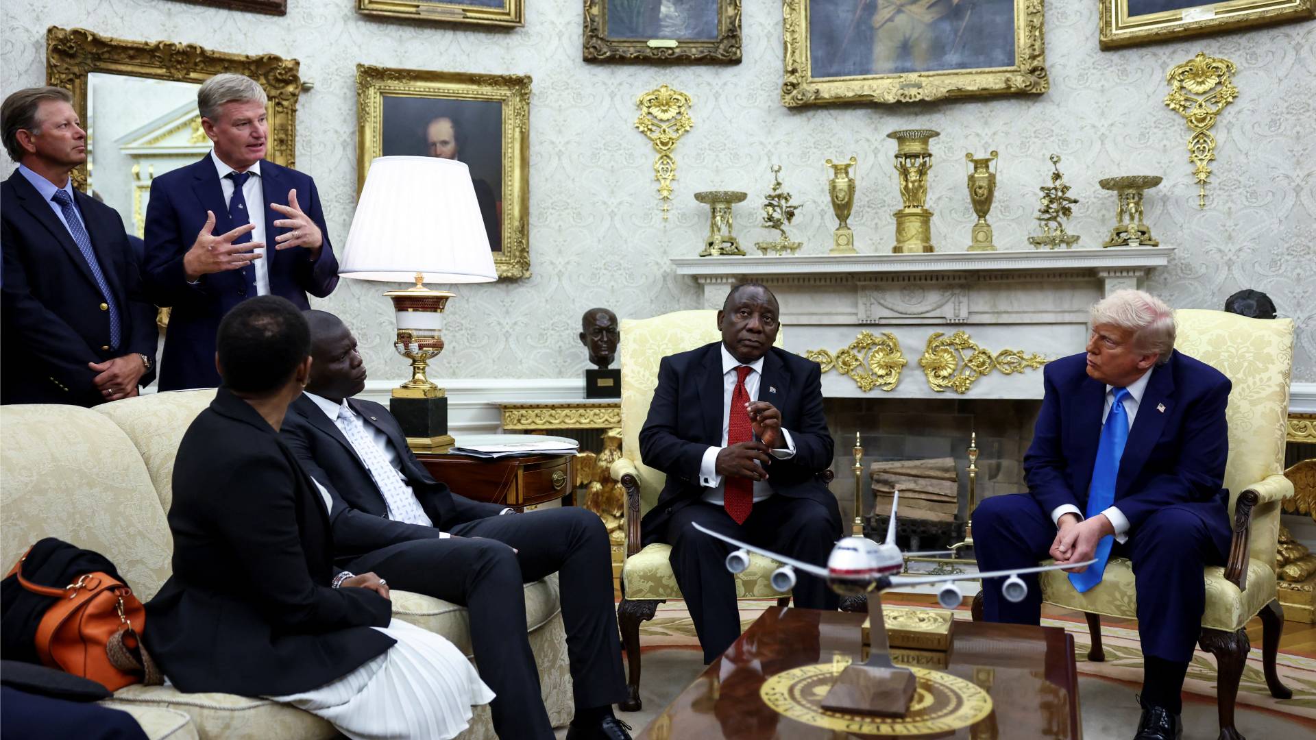 Ενώ οι κάμερες κατέγραφαν, και μετά από κάμποσα λεπτά ήπιας συζήτησης, ο Τραμπ ερωτήθηκε από δημοσιογράφο για το τι θα χρειαστεί ώστε να καταλάβει πως οι αστήρικτοι ισχυρισμοί περί «λευκής γενοκτονίας» στη Νότια Αφρική είναι αναληθείς.