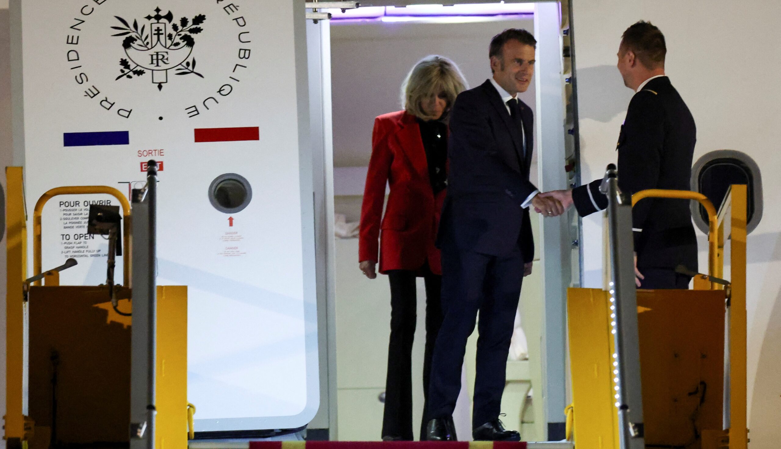 Στη συνέχεια, ο Εμανουέλ Μακρόν μοιάζει να απλώνει το χέρι του στη σύζυγό του, όπως συνηθίζει, αλλά εκείνη δεν το πιάνει, με τους δύο να κατεβαίνουν πλάι πλάι από το αεροσκάφος.