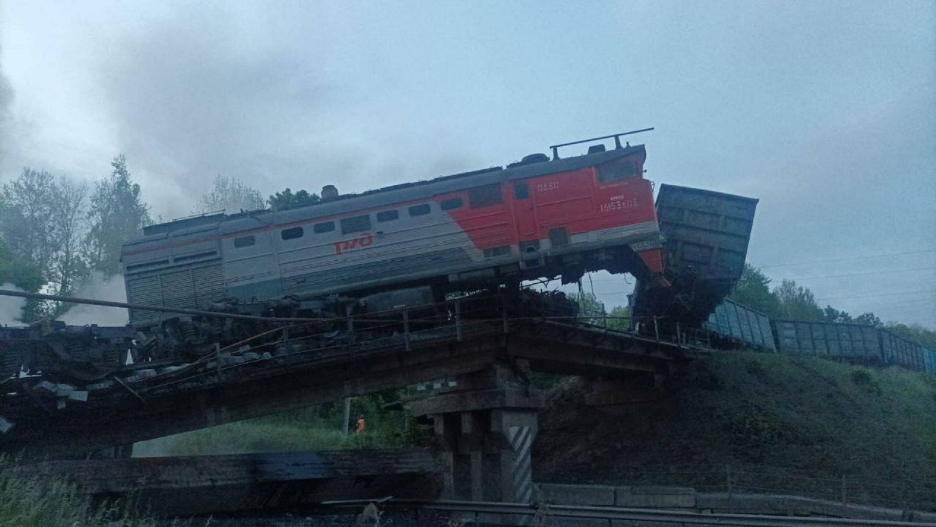 Σύμφωνα με τον υπηρεσιακό περιφερειάρχη της Κουρσκ Χινστάιν, ο εμπορευματικός συρμός «έπεσε στον δρόμο που περνά κάτω από τη γέφυρα» και «πήρε φωτιά». Οι μηχανοδηγοί του τραυματίστηκαν και διακομίστηκαν σε νοσοκομείο, πρόσθεσε.