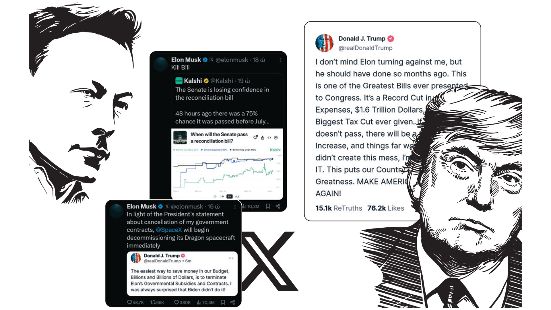 Αμέσως μετά άρχισαν να μαζεύονται τα πρώτα απειλητικά σύννεφα, με τις επικριτικές τοποθετήσεις του Μασκ για το «μεγάλο, όμορφο νομοσχέδιο» που ψηφίστηκε από τη Βουλή των Αντιπροσώπων, συμπυκνώνοντας τις βασικές προτεραιότητες του Τραμπ για τη φορολογική πολιτική, τις κρατικές δαπάνες και τη μείωση της μετανάστευσης. Ο ιδιοκτήτης της Tesla, της SpaceX και του Χ θεώρησε ότι το επίμαχο νομοσχέδιο θα εκτοξεύσει στα ουράνια το έλλειμμα και θα προκαλέσει ύφεση προς το τέλος του τρέχοντος έτους.
