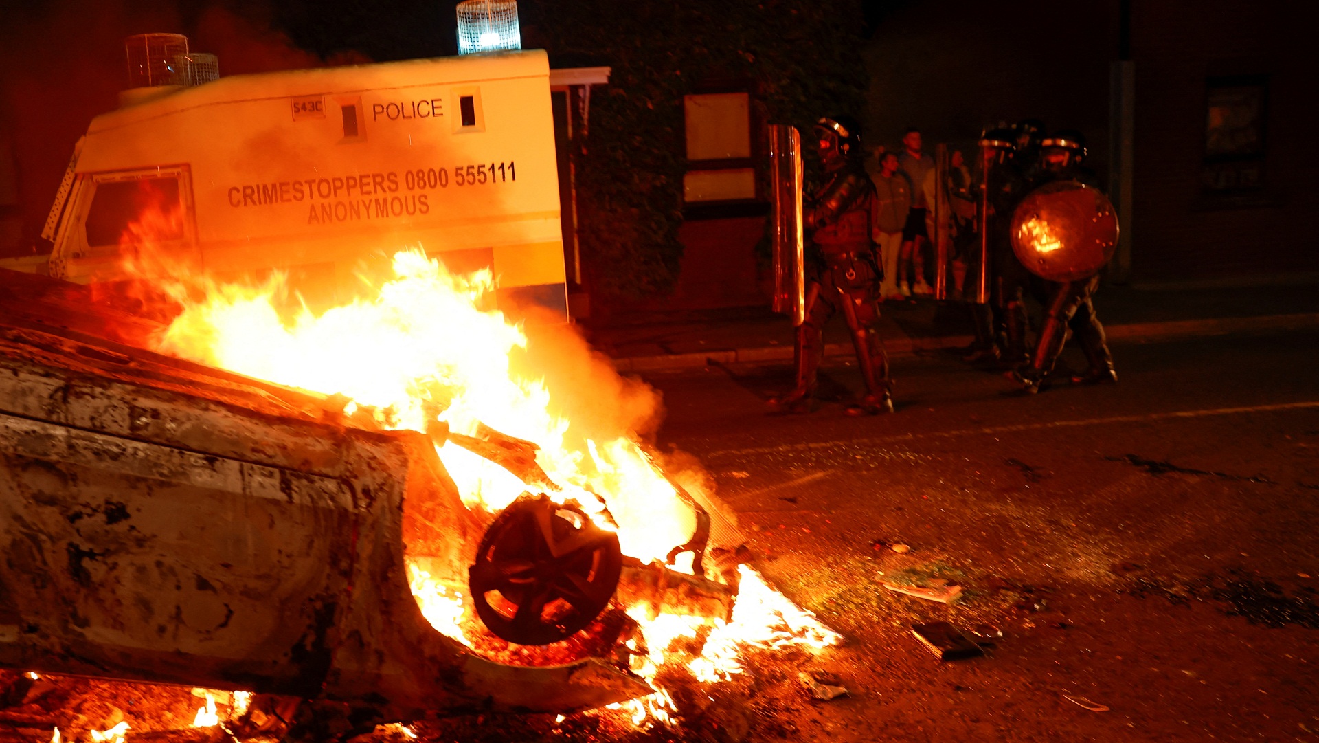 Η αστυνομία αναφέρει πως βρίσκεται αντιμέτωπη με διατάραξη της δημόσιας τάξης σε τμήμα της πόλης, η οποία απέχει περίπου 45 χιλιόμετρα από το Μπέλφαστ, καλώντας τους 31.000 πολίτες της να αποφύγουν την περιοχή.