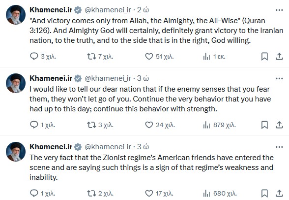 - 17:39Χαμενεΐ στους Ιρανούς: «Συνεχίστε με δύναμη – Μη δείξετε φόβο»