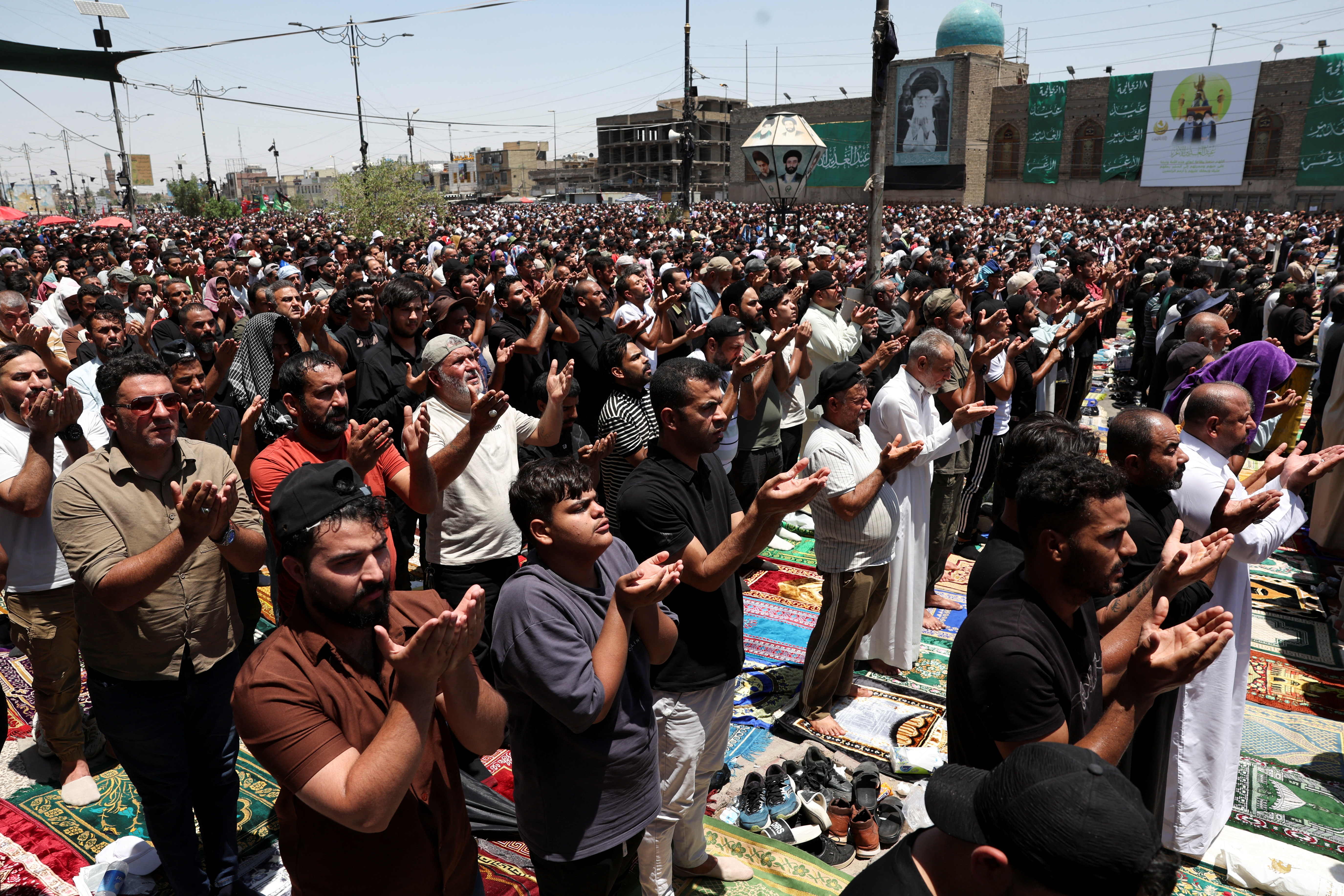 - 14:20Υποστηρικτές του Iρακινού σιίτη κληρικού Μοκτάντα αλ-Σαντρ διαδήλωσαν στη Βαγδάτη μετά την προσευχή της Παρασκευής, σε ένδειξη διαμαρτυρίας για τις παραβιάσεις του εναέριου χώρου του Ιράκ, εν μέσω της σύγκρουσης Ιράν - Ισραήλ