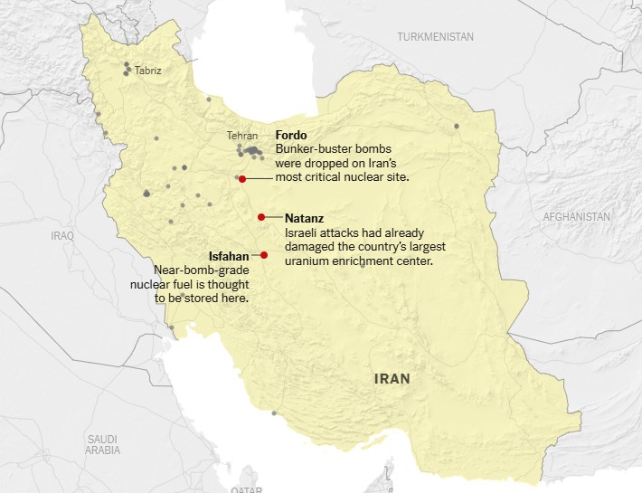 - Λίγο μετά τα μεσάνυχτα, τοπική ώρα, ο Ντόναλντ Τραμπ ανακοίνωσε ότι οι ΗΠΑ πραγματοποίησαν επιθέσεις σε τρεις πυρηνικές εγκαταστάσεις στο Ιράν – στο Φορντό, στο Νατάνζ και στο Ισφαχάν.