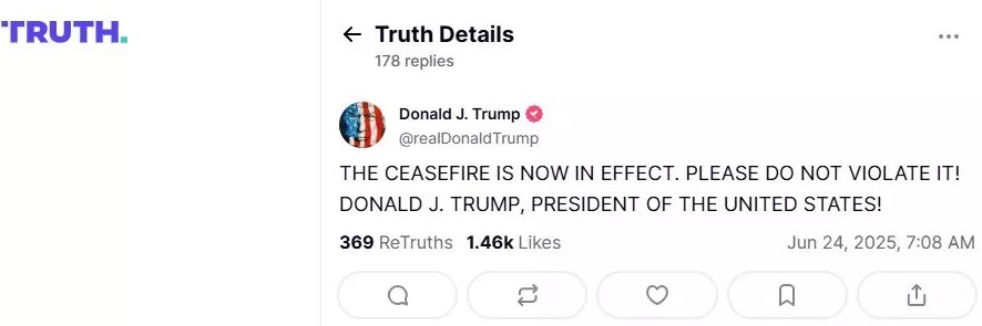 «Εχει συμφωνηθεί πλήρως μεταξύ του Ισραήλ και του Ιράν ότι θα υπάρξει πλήρης και ολική κατάπαυση πυρός (σε περίπου 6 ώρες από τώρα, όταν το Ισραήλ και το Ιράν θα έχουν ολοκληρώσει τις τελικές αποστολές τους που βρίσκονται σε εξέλιξη!)», έγραψε ο Τραμπ στις 18:00 τοπική ώρα στην Ουάσιγκτον.
