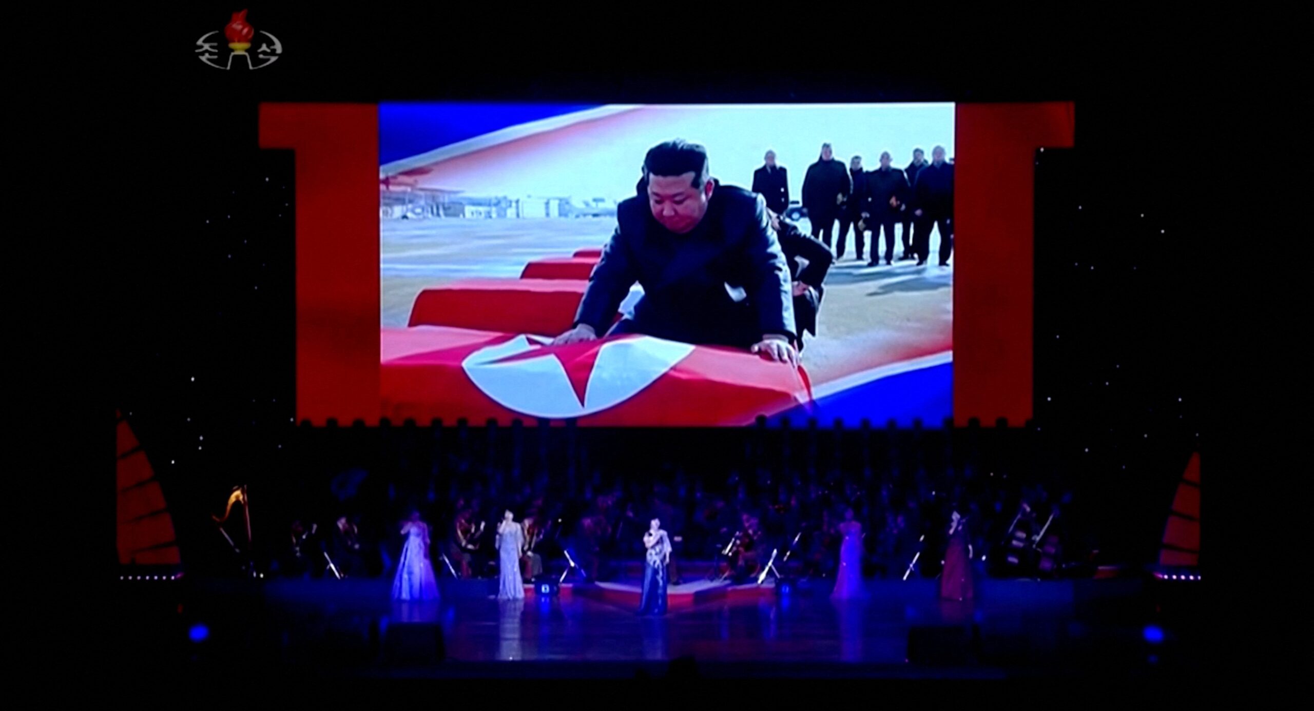 Φωτογραφίες του ηγέτη της Βόρειας Κορέας που στέκεται μπροστά σε μια σειρά από φέρετρα, καλυμμένα με τη σημαία της χώρας, προβλήθηκαν σε πανηγυρική εκδήλωση που πραγματοποιήθηκε την Κυριακή, με αφορμή την πρώτη επέτειο του στρατιωτικού αμυντικού συμφώνου μεταξύ της Πιονγιάνγκ και της Μόσχας.