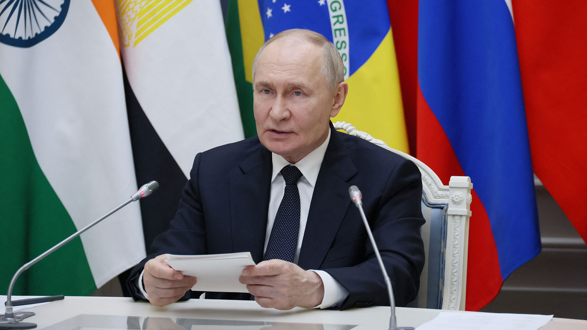 Ο Ρώσος πρόεδρος μίλησε στη σύνοδο κορυφής του Ρίο ντε Τζανέιρο μέσω τηλεδιάσκεψης εξαιτίας του εντάλματος σύλληψης που έχει εκδοθεί εναντίον του από το Διεθνές Ποινικό Δικαστήριο ως υπόπτου για την τέλεση εγκλημάτων πολέμου στην Ουκρανία.
