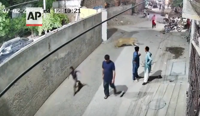 Στο δραματικό βίντεο που δόθηκε στη δημοσιότητα, φαίνεται το λιοντάρι να πηδά το τοιχίο και τρέχοντας, μέσα σε έναν δρομο γεμάτο ανθρώπους, να επιτίθεται στα θύματα.