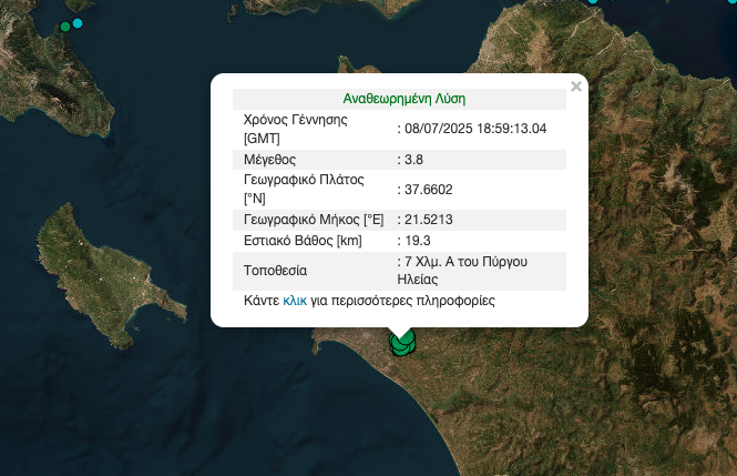 Σεισμός 3,8 βαθμών της κλίμακας Ρίχτερ σημειώθηκε στις 22:00 κοντά στην πόλη του Πύργου. Η σεισμική δόνηση έγινε αισθητή και σε άλλες περιοχές της Ηλείας.