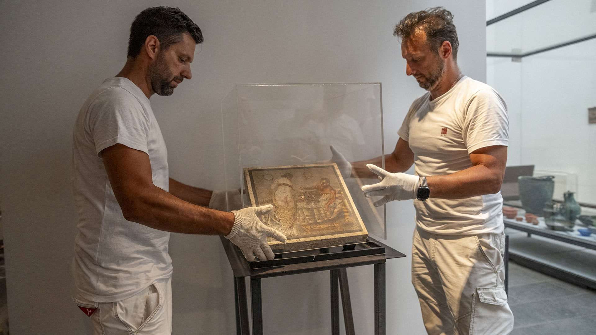 Το ψηφιδωτό –που απεικονίζει έναν άνδρα ξαπλωμένο στο κρεβάτι, με τη σύντροφό του να στέκεται μπροστά του– επαναπατρίστηκε από τη Γερμανία ύστερα από διπλωματικές προσπάθειες.