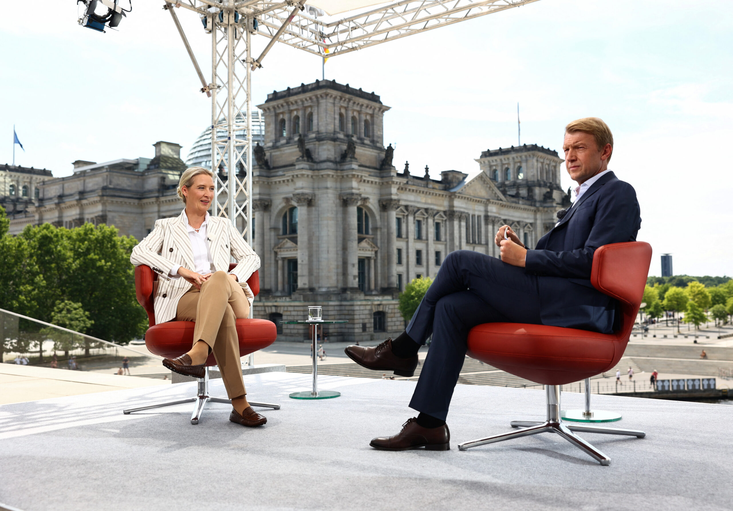 Διαδηλωτές ενάντια στο ακροδεξιό κόμμα «Εναλλακτική για τη Γερμανία» (AfD) διέκοπταν συνέντευξη που παραχωρούσε η επικεφαλής του κόμματος, Αλις Βάιντελ, την Κυριακή στον κρατικό ραδιοτηλεοπτικό φορέα του ARD.
