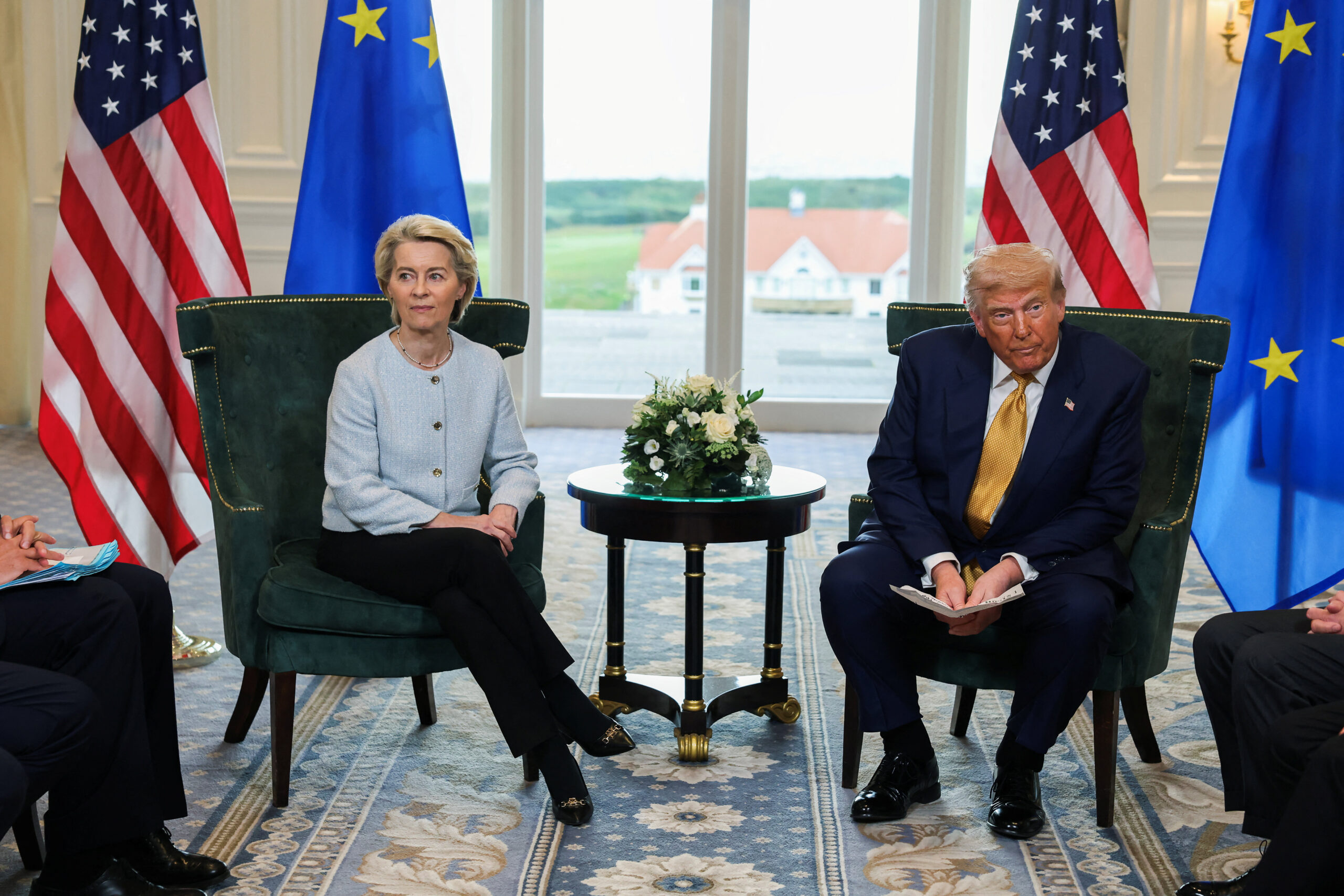 Η φωτογραφία, που τραβήχτηκε καθώς η Ευρωπαϊκή Ενωση και οι Ηνωμένες Πολιτείες σφράγιζαν μία εύθραυστη δασμολογική εκεχειρία στο γκολφ κλαμπ του Αμερικανού προέδρου Ντόναλντ Τραμπ στη Σκωτία, στις 27 Ιουλίου, αποτύπωσε τη δυσφορία της ευρωπαϊκής πλευράς για μία συμφωνία που ήταν απλώς «η καλύτερη που μπορούσε να έχει επιτευχθεί».