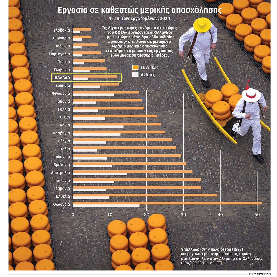 Ολα άρχισαν με τις γυναίκες. Η Ολλανδία διέθετε παραδοσιακό ανδροκρατούμενο εργασιακό μοντέλο, έως ότου οι γυναίκες εισήλθαν μαζικά στην αγορά εργασίας σε θέσεις μερικής απασχόλησης τις δεκαετίες του 1980, 1990 και 2000, δημιουργώντας την κατηγορία των νοικοκυριών με «ενάμιση μισθό». Η φορολογική νομοθεσία, από τη μεριά της, ευνόησε τα νοικοκυριά αυτά. Με το πέρασμα του χρόνου, καθώς τα εργασιακά αυτά μοντέλα έγιναν αποδεκτά, η μερική απασχόληση έγινε περισσότερο δημοφιλής και μεταξύ των ανδρών, ιδίως όταν αυτοί έχουν μικρά παιδιά.