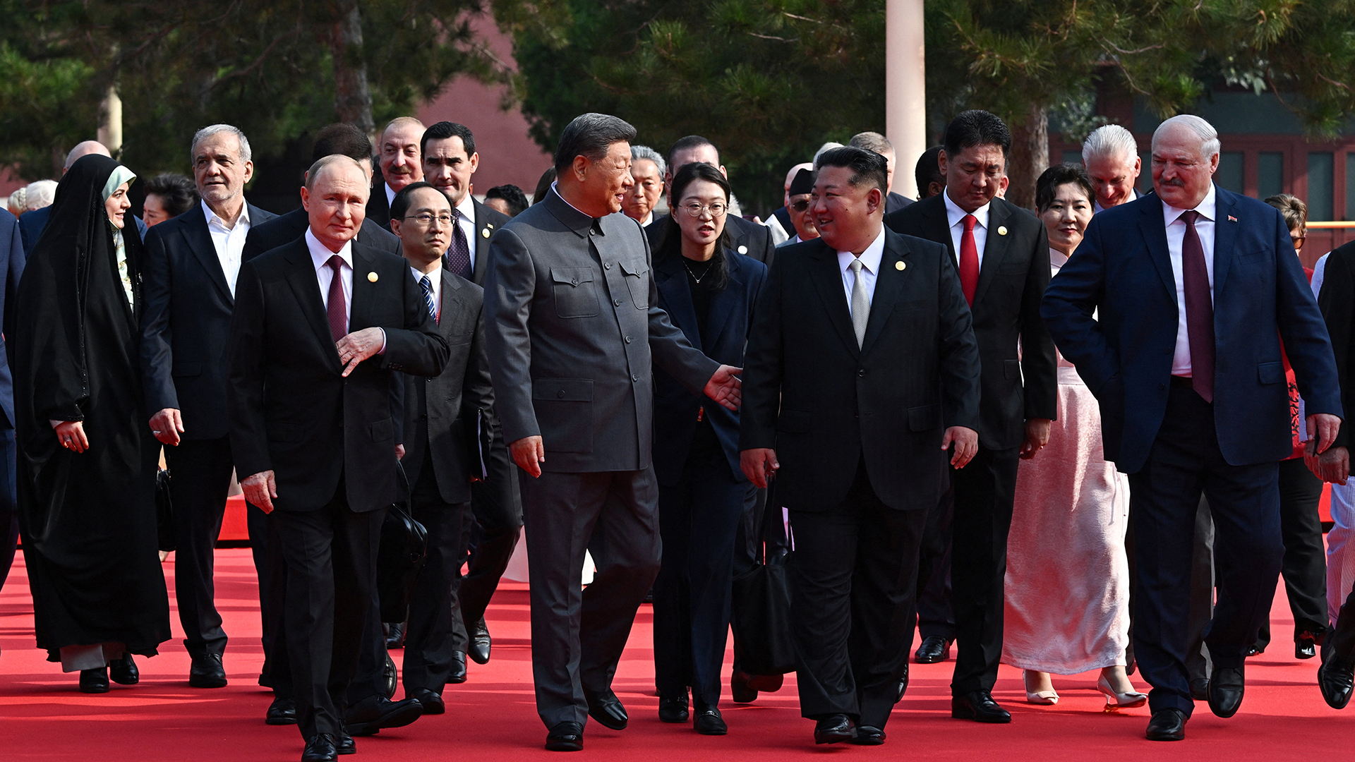 Ο κ. Σι έσφιξε το χέρι κατά σειρά του κ. Πούτιν, του κ. Κιμ, κατόπιν άλλων υψηλών προσκεκλημένων του. Κατόπιν, ανταλλάσσοντας αβρότητες, οι ηγέτες βάδισαν μαζί πάνω σε κόκκινο χαλί, με τον κ. Πούτιν εκ δεξιών και τον κ. Κιμ εξ ευωνύμων του κ. Σι, που προπορεύτηκε, έως την Τιενανμέν για την παρέλαση, καθώς το στιγμιότυπο αναμεταδιδόταν απευθείας από την κινεζική κρατική τηλεόραση.
