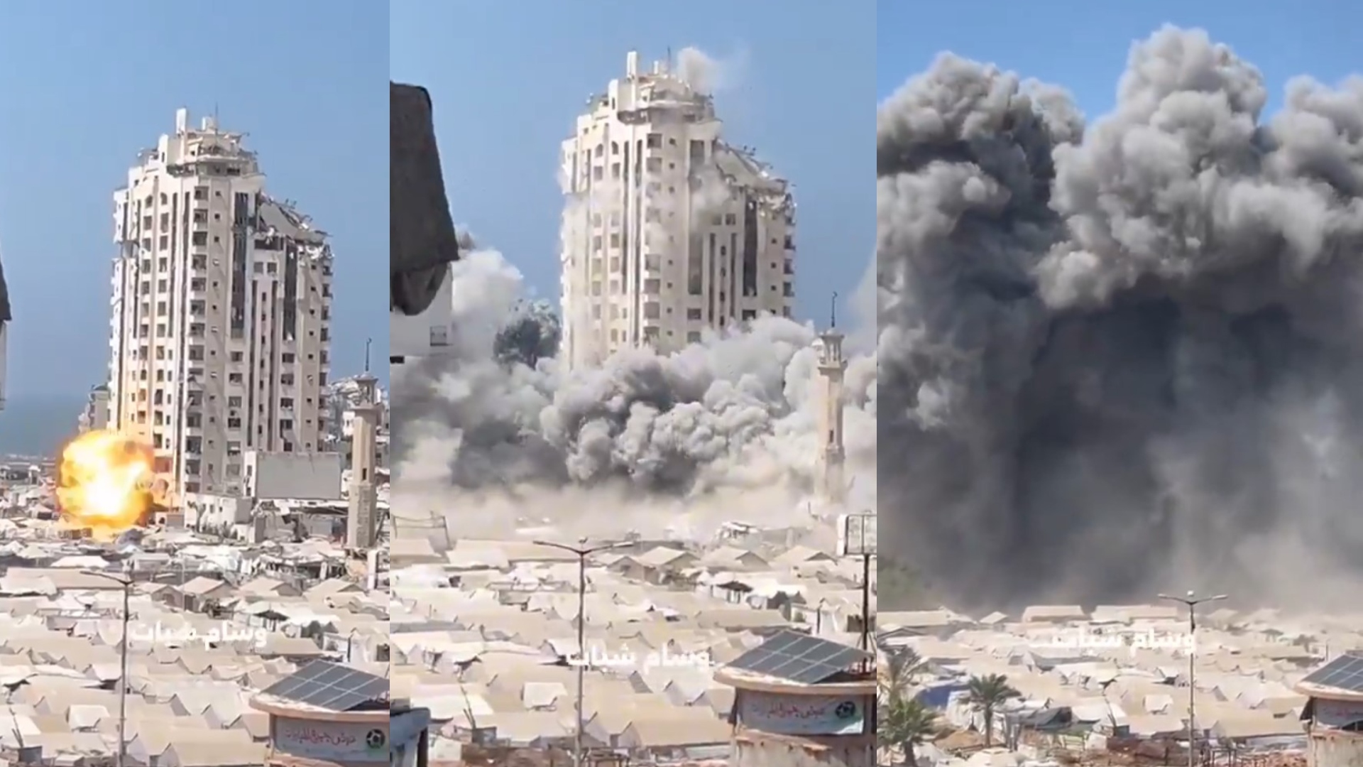 The moment Israeli fighter jets showered the Mushtaha Tower in Gaza City with missiles this afternoon, reducing it to rubble and displacing hundreds of its residents as well as many others who had sought refuge nearby. pic.twitter.com/6d1Ip3FU1X