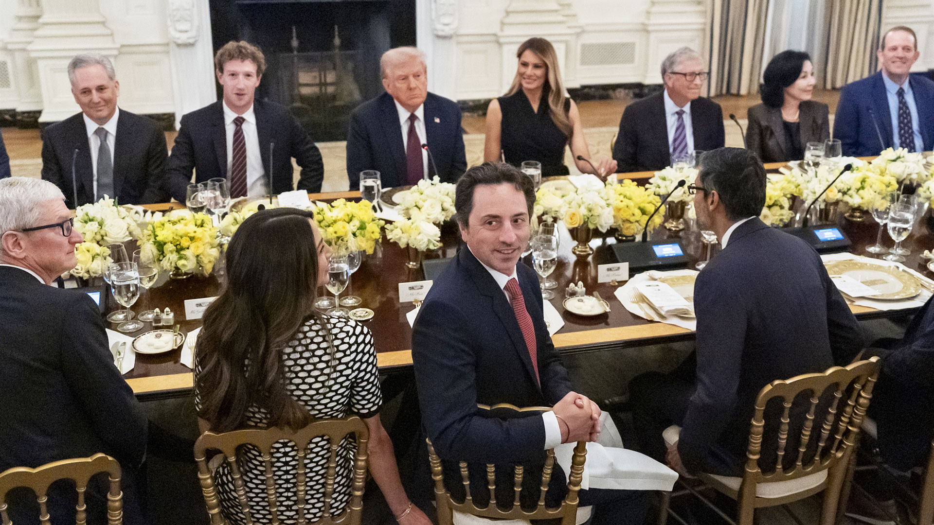 Στην τραπεζαρία του Λευκού Οίκου δείπνησαν ο Μαρκ Ζούκερμπεργκ του Facebook, ο Τιμ Κουκ της Apple, ο Μπιλ Γκέιτς της Microsoft, ο Σαμ Αλτμαν του OpenAI και ο Σεργκέι Μπριν της Google, μεταξύ άλλων. Οι ισχυροί παίκτες της Σίλικον Βάλεϊ διαγωνίσθηκαν σε επαίνους προς τον Τραμπ και την Πρώτη Κυρία, Μελάνια, εκφράζοντας με τον τρόπο αυτό την ευγνωμοσύνη τους για τη χαλάρωση των ρυθμιστικών κανόνων για την κατασκευή data centers.