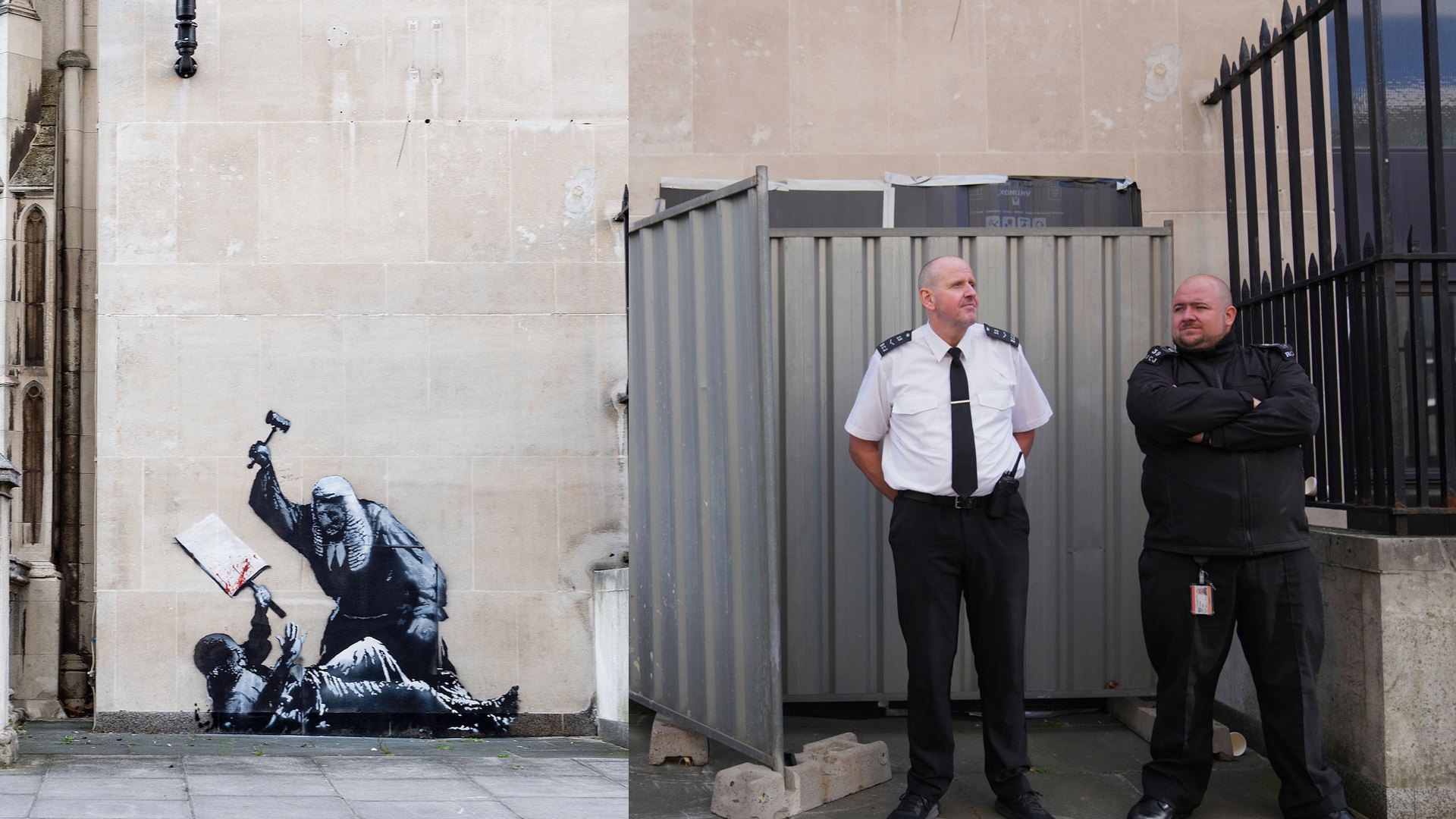 Ενα νέο γκράφιτι του διάσημου καλλιτέχνη Banksy, που δείχνει έναν δικαστή να χτυπά με το σφυρί του έναν διαδηλωτή, εμφανίστηκε έξω από δικαστήριο του Λονδίνου και προκάλεσε αντιδράσεις.