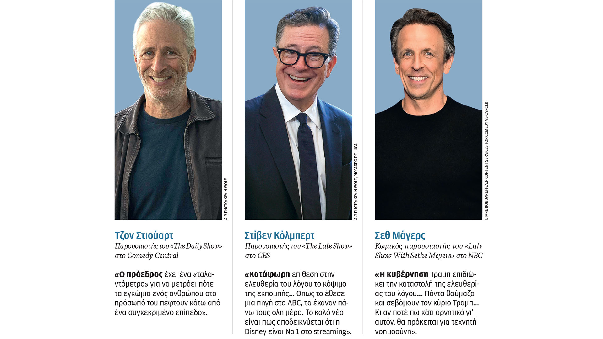 Πλειάδα Αμερικανών παρουσιαστών εκπομπών πολιτικής σάτιρας στάθηκαν στο πλευρό του Τζίμι Κίμελ, τη νύχτα της Πέμπτης. Στην έκτακτη εκπομπή του «The Daily Show», ο Τζον Στιούαρτ τόνισε εμφατικά ότι είναι ένας «πατριωτικά υπάκουος παρουσιαστής» και καυτηρίασε το κοινό του τη στιγμή που γιουχάιζε βίντεο του Τραμπ. «Οι επικριτές μπορεί να πουν ότι οι ανησυχίες αυτής της κυβέρνησης για τα όρια της ελευθερίας του λόγου είναι απλά ένα κυνικό τέχνασμα, ένα παραπέτασμα καπνού για να κρύψει την πρωτοφανή συγκέντρωση εξουσίας και τον χωρίς αρχές εκφοβισμό», είπε ο Στιούαρτ, για να προσθέσει ευθύς αμέσως: «Κάποιοι θα το έλεγαν αυτό, εγώ όμως όχι, πιστεύω ότι είναι καταπληκτικοί».