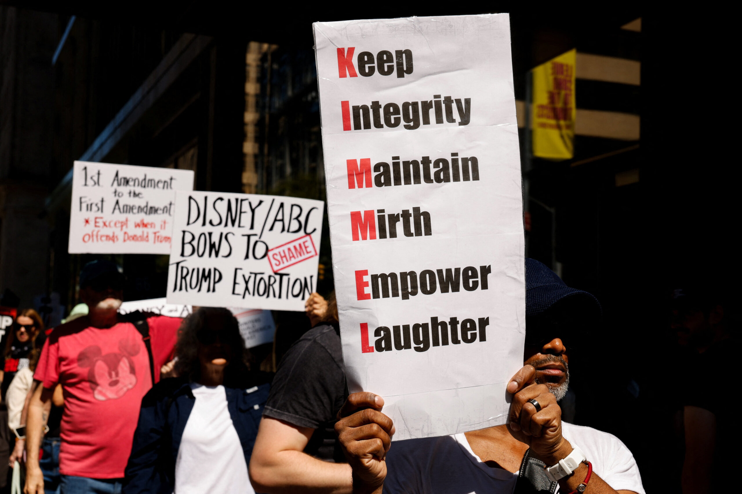 Σήμερα, στο Μανχάταν, δεκάδες κειμενογράφοι, μεταξύ αυτών ορισμένοι που απασχολούνται στο ABC, πραγματοποίησαν πορεία στο πεζοδρόμιο, έξω από τον ουρανοξύστη όπου στεγάζονται τα γραφεία της Disney προκειμένου να «προστατεύσουν την ελευθερία του λόγου» σε μια κινητοποίηση που οργάνωσε η συνδικαλιστική ένωσή τους Writers Guild of America.