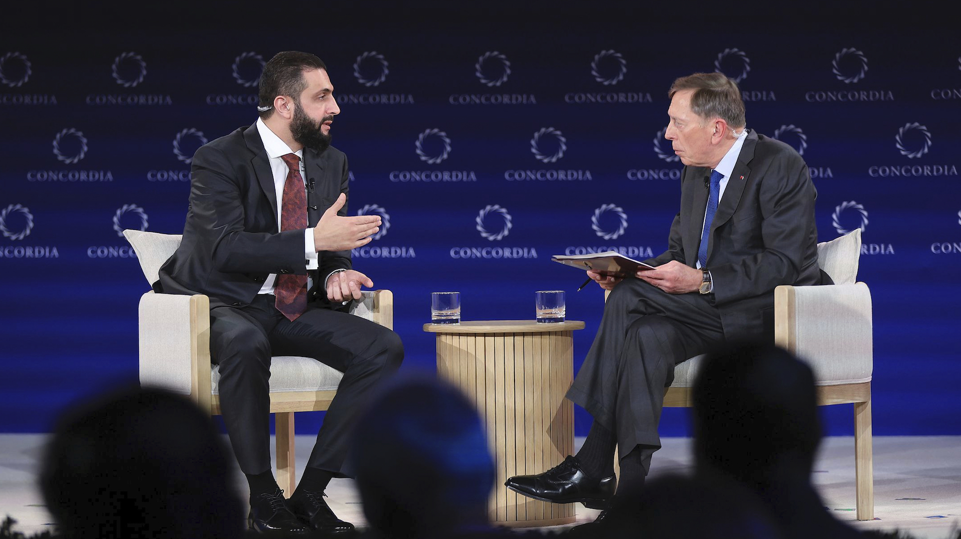 Το 2007, ο Ντέιβιντ Πετρέους ήταν ο διοικητής των αμερικανικών δυνάμεων που πολεμούσαν στο Ιράκ ενάντια στους τζιχαντιστές· και ο Αλ Σάρα, από την άλλη πλευρά, ένας τους τζιχαντιστές που είχαν πάρει τα όπλα ενάντια στους Αμερικανούς. Ο νυν πρόεδρος της Συρίας είχε μάλιστα τότε συλληφθεί από τις αμερικανικές δυνάμεις και φυλακιστεί. Οι δυο τους, Πετρέους και Αλ Σάρα, ήταν άλλοτε σε πόλεμο. Στις 22 Σεπτεμβρίου, ωστόσο, βρέθηκαν να συμπρωταγωνιστούν σε ένα 40λεπτο one-on-one ντιμπέιτ στη Νέα Υόρκη, στο πλαίσιο της Concordia Summit. Μίλησαν για τα παλιά, προφανώς, αλλά και για όσα έπονται ή μπορεί να ακολουθήσουν, φανερώνοντας διαθέσεις κι αποκαλύπτοντας προσδοκίες.