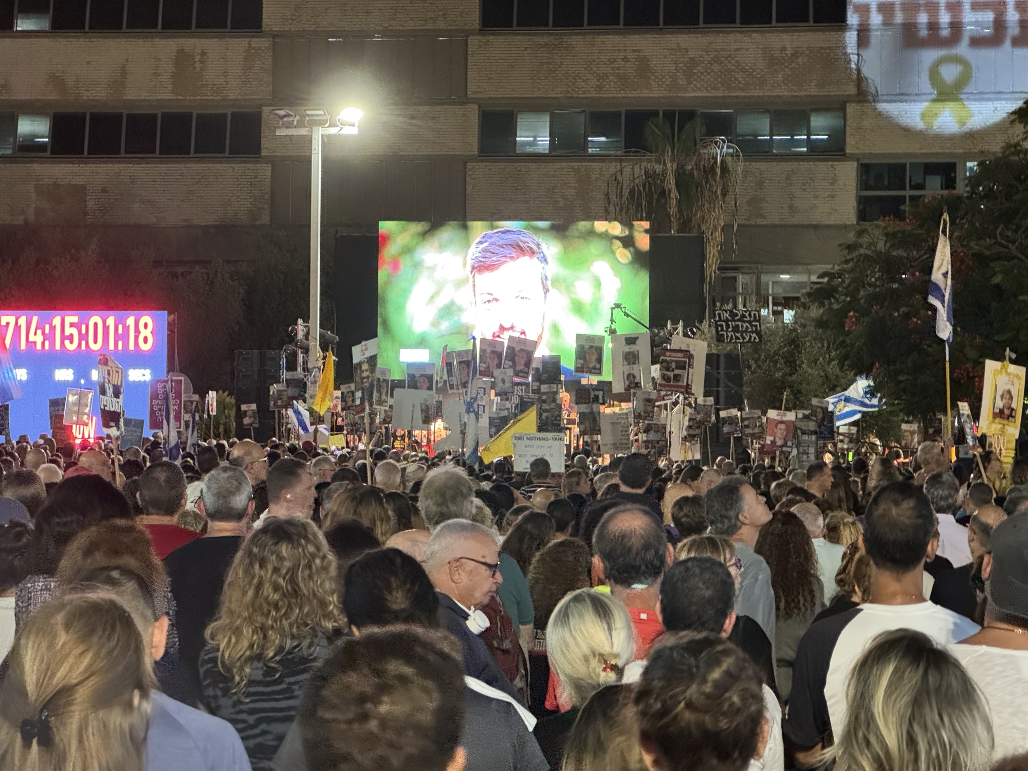 Την τρίτη ημέρα της παραμονής μας στο Τελ Αβίβ, βρεθήκαμε μπροστά σε μια αντικυβερνητική διαδήλωση στην «πλατεία ομήρων» απέναντι από το αρχηγείο των Ισραηλινών Δυνάμεων. Η συμμετοχή δεν ξεπερνάει τις 10.000. Συγγενείς ομήρων ζητούν την άμεση απελευθέρωση των ομήρων και τον τερματισμό του πολέμου, ενώ ο χώρος γεμίζει με πλακάτ με φωτογραφίες αγνοουμένων και σκοτωμένων στρατιωτών.