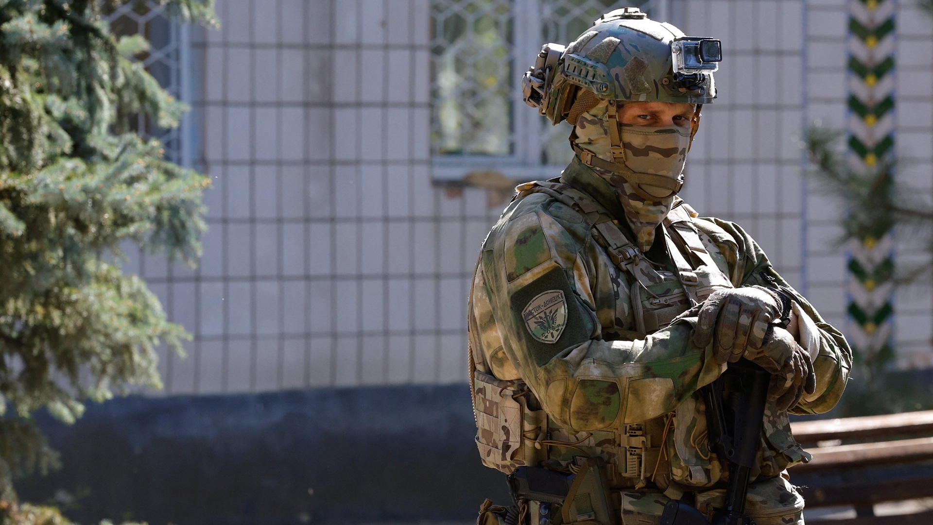 Σε βίντεο που δόθηκε στη δημοσιότητα από το υπουργείο Αμυνας της Ρωσικής Ομοσπονδίας, διακρίνονται στρατιώτες που κρατούν ψηλά μια ρωσική σημαία να προωθούνται στο Σαντριχολόβε.