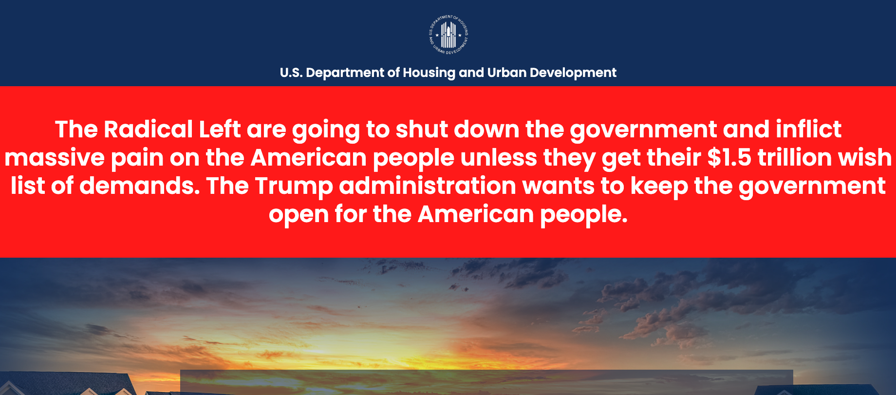 Εν μέσω εντεινόμενης ανησυχίας για διακοπή της λειτουργίας των υπηρεσιών της ομοσπονδιακής κυβέρνησης των ΗΠΑ, γνωστό και ως shutdown, το υπουργείο Στέγασης και Αστικής Ανάπτυξης ανήρτησε ένα μήνυμα στην ιστοσελίδα του, στρέφοντας τα πυρά του στη «ριζοσπαστική Αριστερά».
