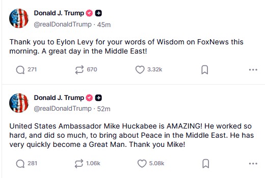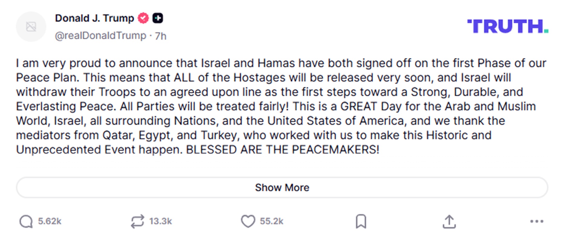 Λιγότερο από 10 λεπτά μετά, δημοσίευσε στο Truth Social ότι τόσο το Ισραήλ όσο και η Χαμάς είχαν συμφωνήσει στην πρώτη φάση του ειρηνευτικού σχεδίου των ΗΠΑ. Σηματοδοτεί «τα πρώτα βήματα προς μια Ισχυρή, Διαρκή και Αιώνια Ειρήνη», τόνισε.