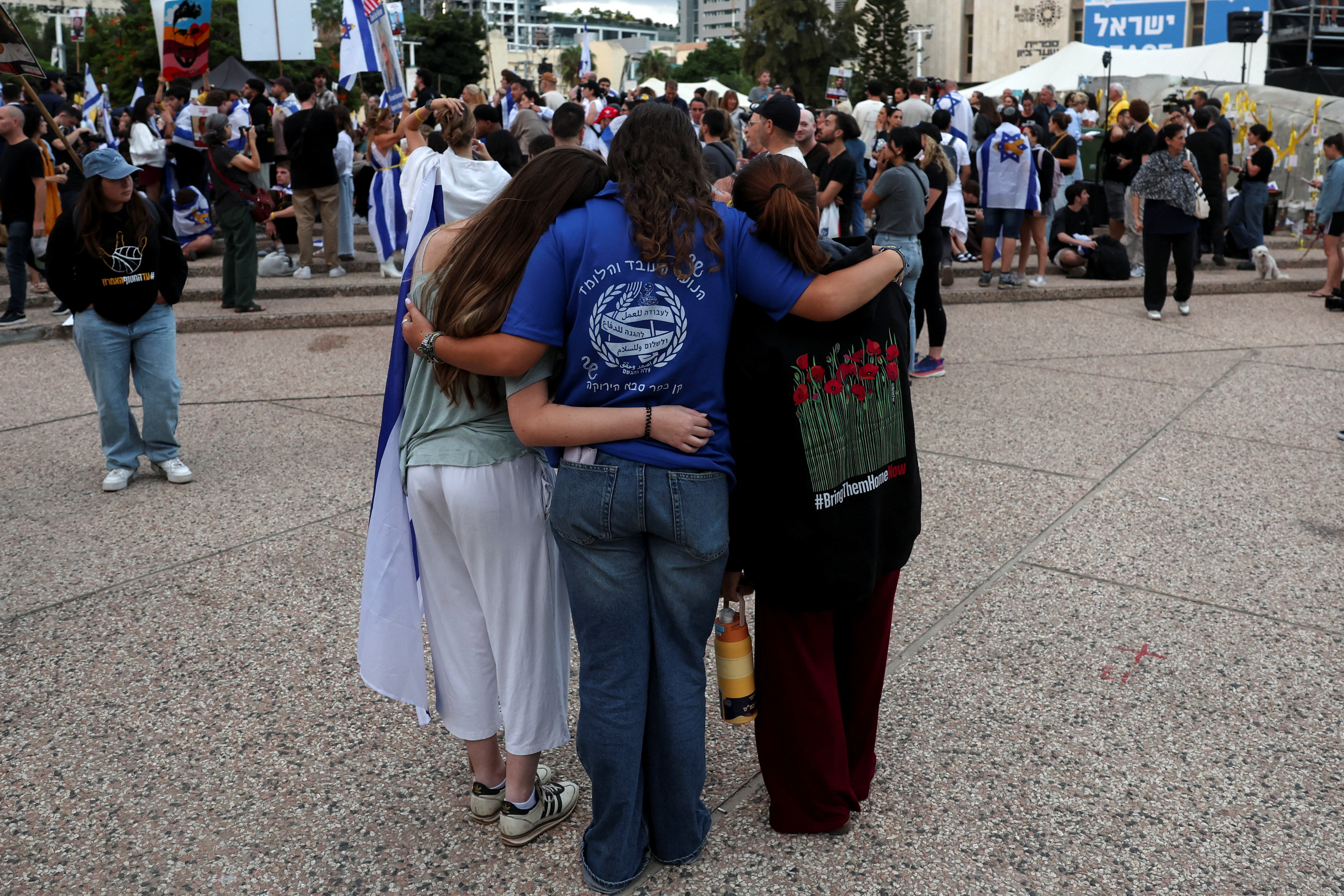 Κόσμος έχει συγκεντρωθεί στην «Πλατεία Ομήρων» στο Τελ Αβίβ του Ισραήλ από νωρίς το πρωί (REUTERS/Ronen Zvulun).