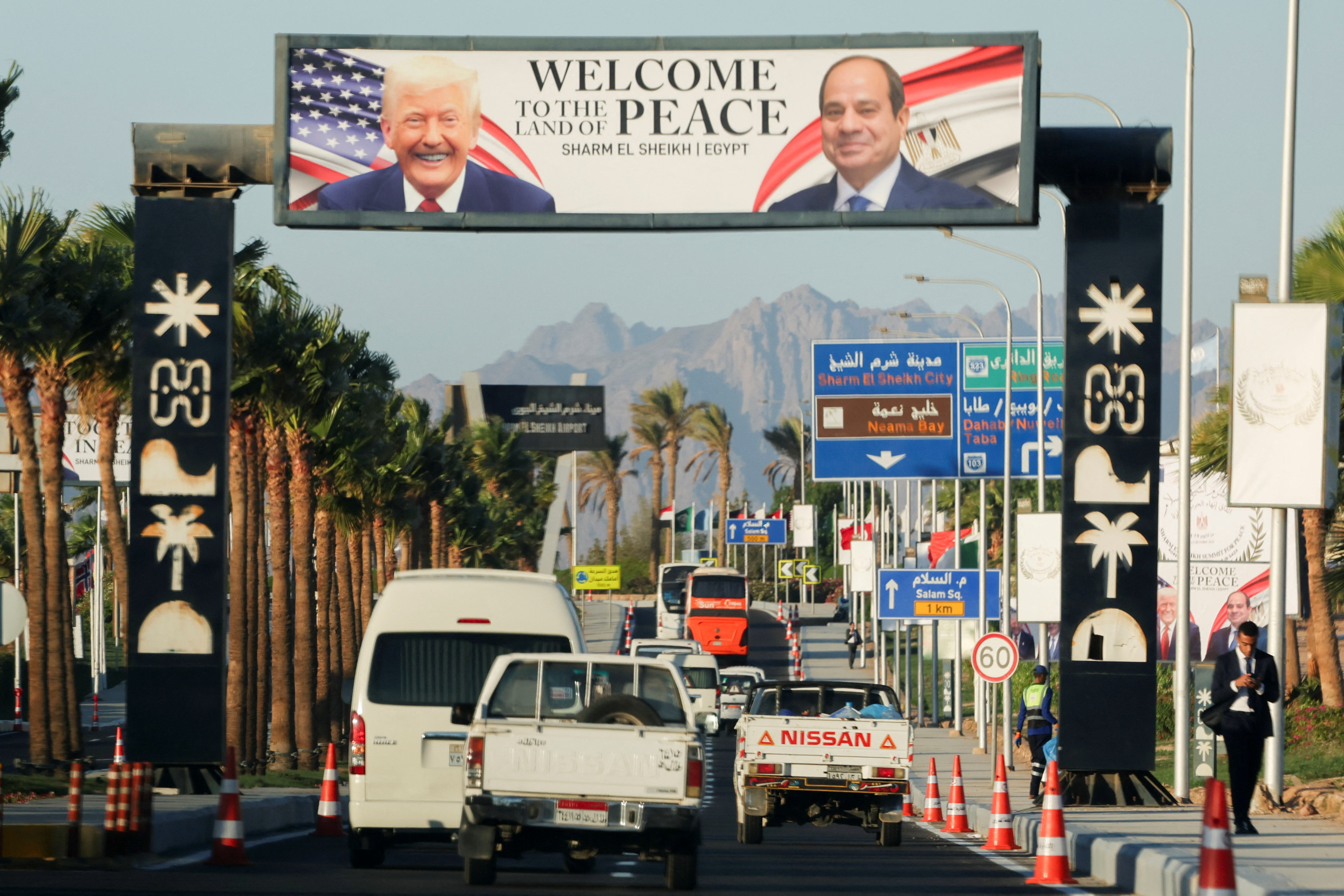 Οχήματα περνούν κάτω από πινακίδα που καλωσορίζει τον πρόεδρο των ΗΠΑ Ντόναλντ Τραμπ, στον δρόμο μπροστά από το Διεθνές Κέντρο Συνεδρίων, ενόψει της διεθνούς συνόδου κορυφής για τη Γάζα. Η σύνοδος πραγματοποιείται εν μέσω εκεχειρίας μεταξύ Ισραήλ και Χαμάς, στο θέρετρο Σαρμ ελ-Σέιχ της Αιγύπτου στην Ερυθρά Θάλασσα (REUTERS/Amr Abdallah Dalsh)