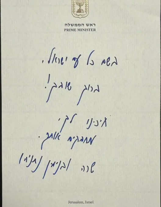 Χειρόγραφο σημείωμα από τον Ισραηλινό πρωθυπουργό Μπέντζαμιν Νετανιάχου και τη σύζυγό του Σάρα Νετανιάχου θα αποτελεί μέρος ενός κιτ που θα δοθεί στους πρόσφατα απελευθερωμένους ομήρους όταν επιστρέψουν στο Ισραήλ. «Εκ μέρους ολόκληρου του λαού του Ισραήλ, καλώς ήρθατε πίσω!», αναφέρει το σημείωμα. «Σας περιμέναμε, σας αγκαλιάζουμε. Σάρα και Μπέντζαμιν Νετανιάχου». Το κιτ περιλαμβάνει επίσης ρούχα, έναν φορητό υπολογιστή, ένα κινητό τηλέφωνο και ένα tablet.