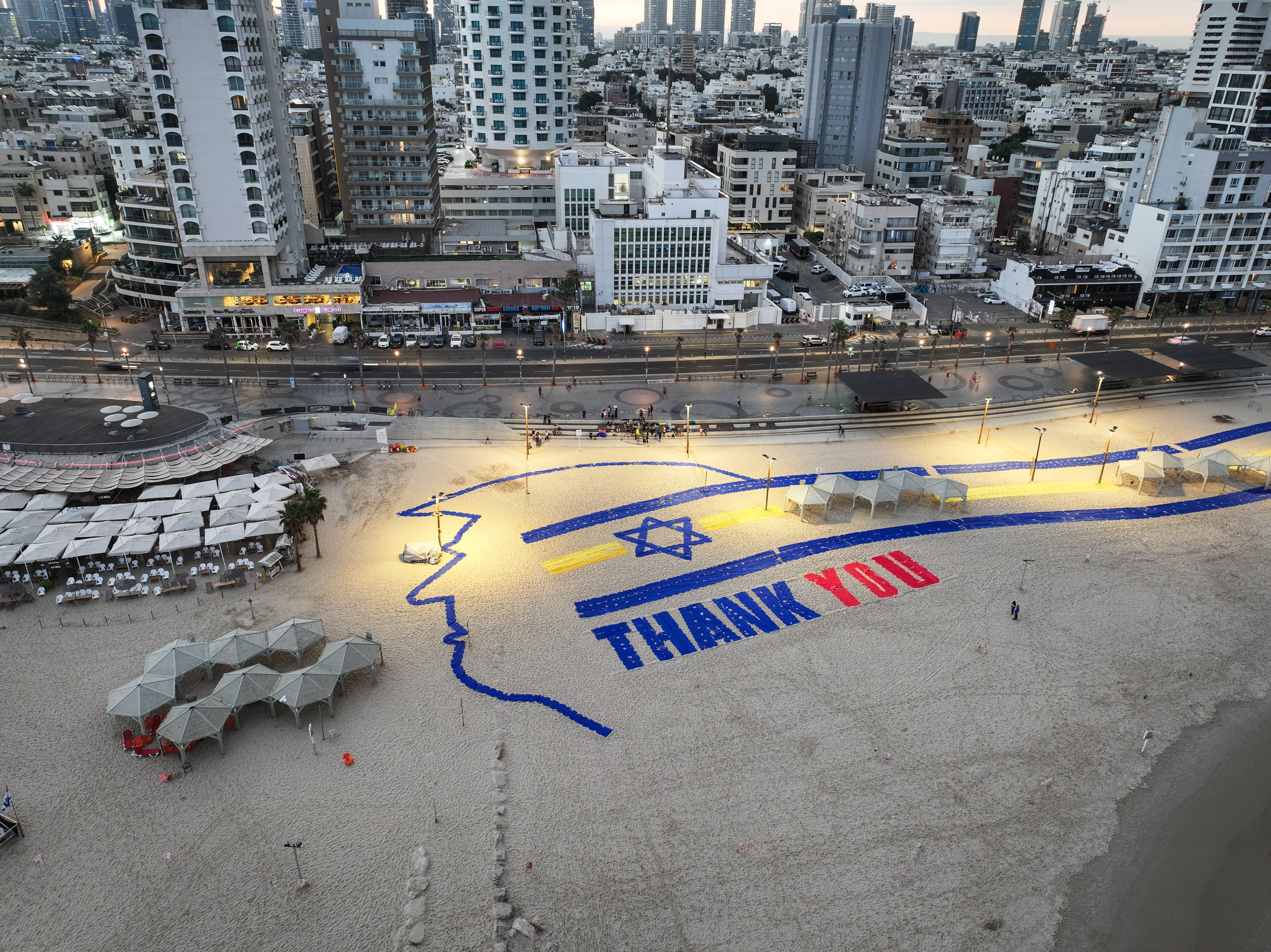 Eικόνα από drone με το «Ευχαριστώ» στον Αμερικανό πρόεδρο Ντόναλντ Τραμπ, κοντά στο προξενείο των ΗΠΑ στο Τελ Αβίβ, Ισραήλ (REUTERS/Ilan Rosenberg).