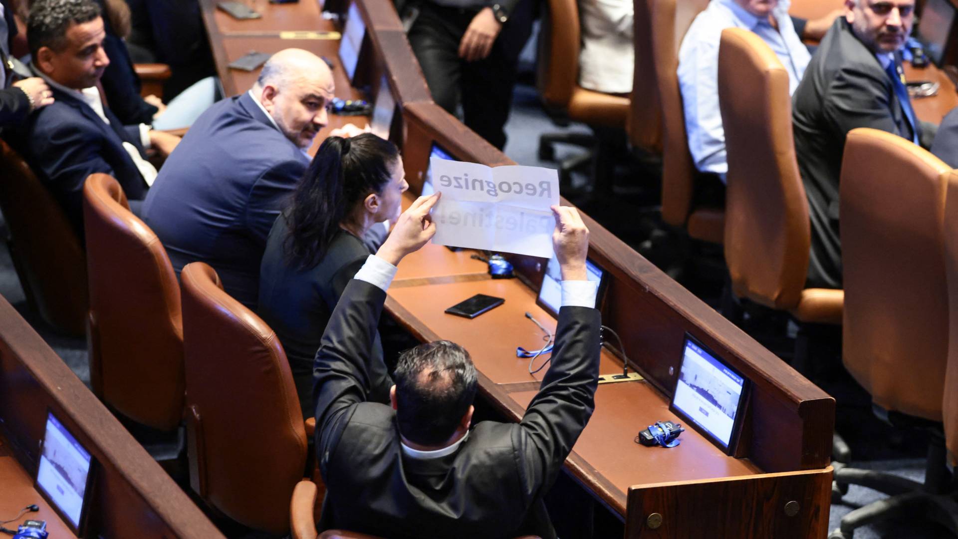 Members of the Israeli parliament Ayman Odeh and Ofer Cassif were removed from the hall after raising signs reading “genocide”. pic.twitter.com/mWqSQnhF8k