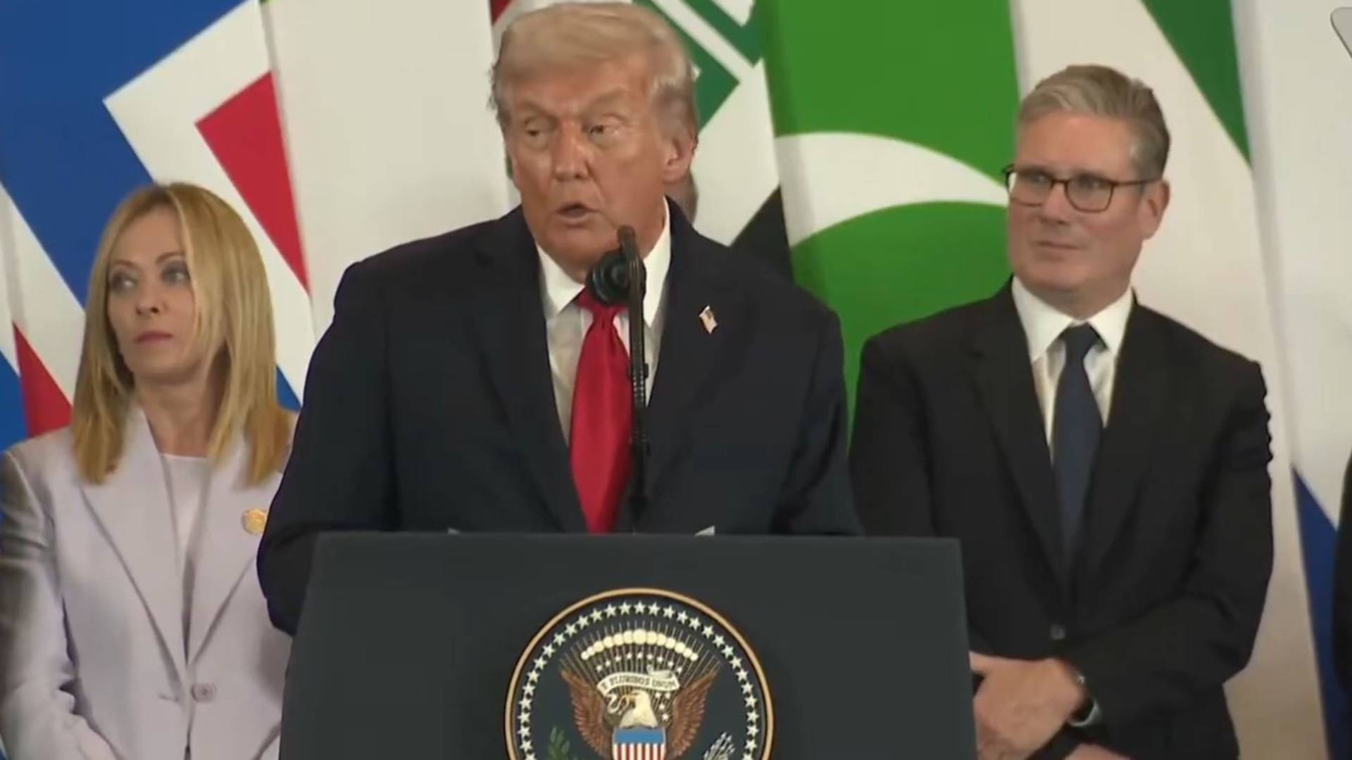 «Πού είναι το Ηνωμένο Βασίλειο;», ρώτησε ο Τραμπ, με τον Βρετανό πρωθυπουργό, Κιρ Στάρμερ, να σηκώνει το χέρι του και να απαντά «Πίσω σας, όπως συνήθως». Στη συνέχεια, πλησίασε τον Αμερικανό πρόεδρο και μετά από μια σύντομη ανταλλαγή, επέστρεψε στη θέση του.