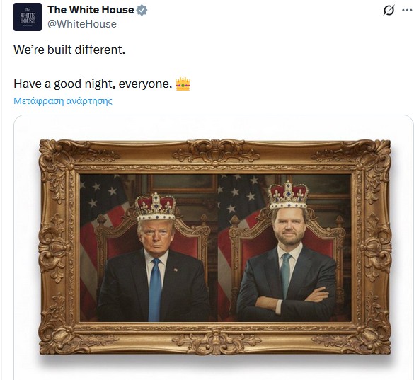 Το Axios επισημαίνει ότι δεν υπάρχει καμία προσπάθεια συγκάλυψης αυτής της νέας ισχύος. Μετά τις μαζικές διαδηλώσεις με σύνθημα «No Kings», ο πρόεδρος (αλλά και ο επίσημος λογαριασμός του Λευκού Οίκου) αναδημοσίευσαν εικόνες και βίντεο τεχνητής νοημοσύνης που απεικόνιζαν τον Τραμπ να φορά στέμμα και βασιλικό μανδύα, ενώ οι Δημοκρατικοί ηγέτες γονάτιζαν μπροστά του.