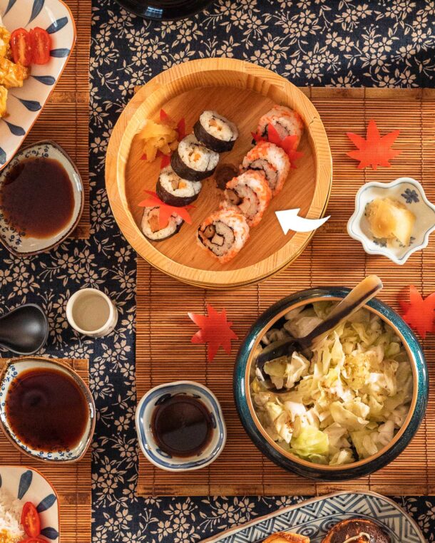 - Γύρω από την πιατέλα βάζουμε ένα μπολάκι με πάστα wasabi, ένα με σάλτσα σόγιας και ένα με πίκλες τζίντζερ, με τα οποία συνοδεύουμε τα maki zushi.