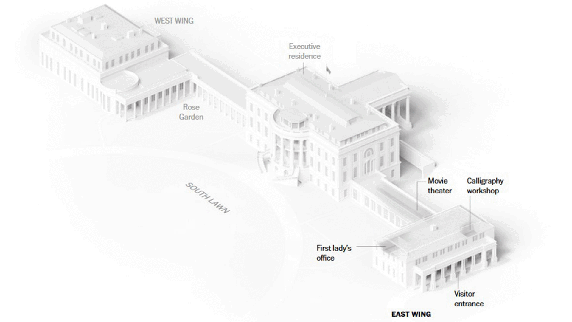 Μέχρι αυτή την εβδομάδα, η Ανατολική Πτέρυγα φιλοξενούσε τον κινηματογράφο του Λευκού Οίκου, τα γραφεία της Πρώτης Κυρίας, καθώς και το εργαστήριο καλλιγραφίας όπου ετοιμάζονταν όλες οι επίσημες προσκλήσεις. Ηταν επίσης το κύριο σημείο εισόδου των επισκεπτών και έναρξης των δημοσίων ξεναγήσεων, οι οποίες έχουν πλέον ανασταλεί επ’ αόριστον, σύμφωνα με την επίσημη ιστοσελίδα του Λευκού Οίκου.