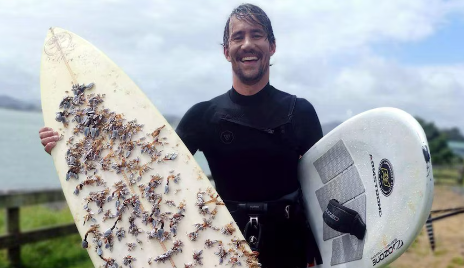 Ο Γάλλος Αλβαρό Μπον έκανε kitesurfing στο Raglan Harbour στο Βόρειο Νησί πριν από περίπου δύο εβδομάδες, όταν βρήκε την σανίδα καλυμμένη με βρύα και οστρακοειδή.