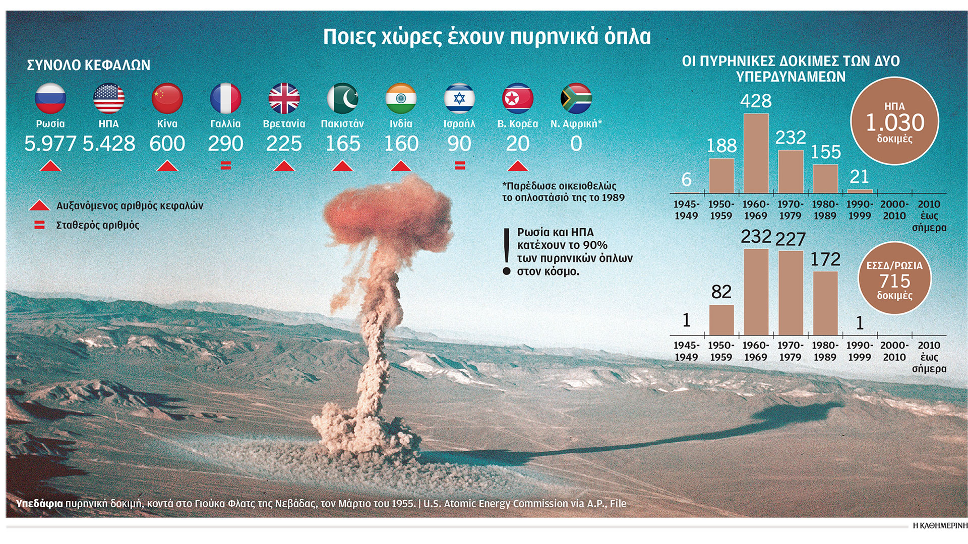 Τέσσερα χρόνια αργότερα, η τότε Σοβιετική Ενωση έπαιρνε τη σκυτάλη, με την έκρηξη της πρώτης της πυρηνικής βόμβας, τον Αύγουστο του 1949. Σύμφωνα με τα Ηνωμένα Εθνη, κατά τη διάρκεια των πέντε δεκαετιών μεταξύ του 1945 και της Συνθήκης για την Πλήρη Απαγόρευση των Πυρηνικών Δοκιμών (CTBT) του 1996, πραγματοποιήθηκαν πάνω από 2.000 πυρηνικές δοκιμές – εκ των οποίων οι 1.032 από τις ΗΠΑ και οι 715 από τη Σοβιετική Ενωση.
