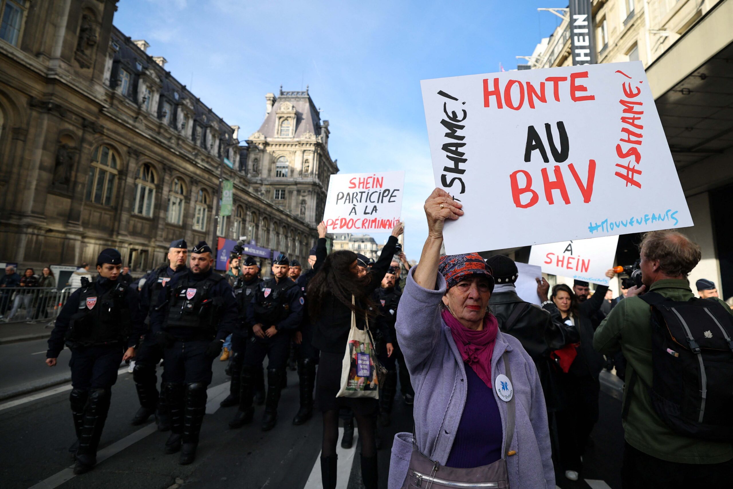 Το πρωί, ακτιβιστές συγκεντρώθηκαν μπροστά από το πολυκατάστημα BHV για να διαμαρτυρηθούν για το άνοιγμα του χώρου 1.200 τετραγωνικών μέτρων, του πρώτου καταστήματος της Shein στον κόσμο, στον έκτο όροφο.