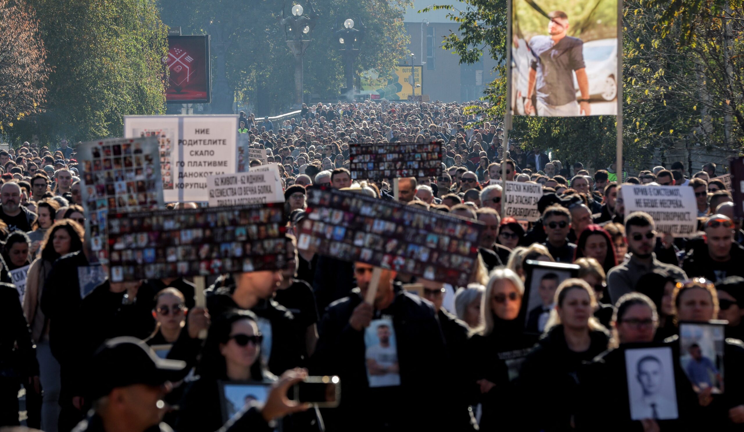 Η σημερινή πορεία στα Σκόπια ξεκίνησε από την κεντρική πλατεία και, περνώντας μπροστά από το Κοινοβούλιο, κατέληξε στο Δικαστικό Μέγαρο. Επικεφαλής βρίσκονταν οι συγγενείς των θυμάτων, κρατώντας ένα μεγάλο πανό με τα πρόσωπα των 63 νεκρών. Στην κορυφή του πανό αναγραφόταν: «63 σκιές θα σας ακολουθούν — κάθε βλέμμα ζητά δικαιοσύνη».