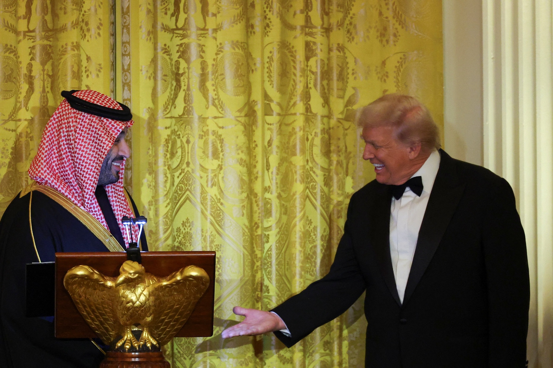 Ο Σαουδάραβας πρίγκιπας διάδοχος Μοχάμεντ μπιν Σαλμάν επέστρεψε χθες στον Λευκό Οίκο έπειτα από επτά χρόνια (η τελευταία φορά που είχε βρεθεί εκεί ήταν τον Μάρτιο του 2018) και, προσφέροντας πια ως δέλεαρ (αλλά και ως διαπραγματευτικό χαρτί) μια δέσμευση για επενδύσεις συνολικού ύψους 1 τρισεκατομμυρίου δολαρίων στις ΗΠΑ, παρουσιάστηκε να παίρνει με το μέρος του τον Ντόναλντ Τραμπ.