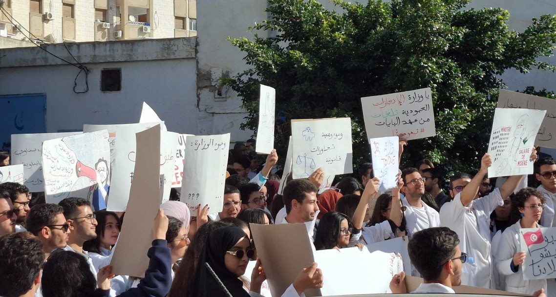 Οι διαδηλωτές, φορώντας λευκές ρόμπες, κράδαιναν πλακάτ που έγραφαν «Αξιοπρέπεια για τους γιατρούς» και «Σώστε τα νοσοκομεία μας» καθώς συγκεντρώνονταν κοντά στο κοινοβούλιο της Τυνησίας.