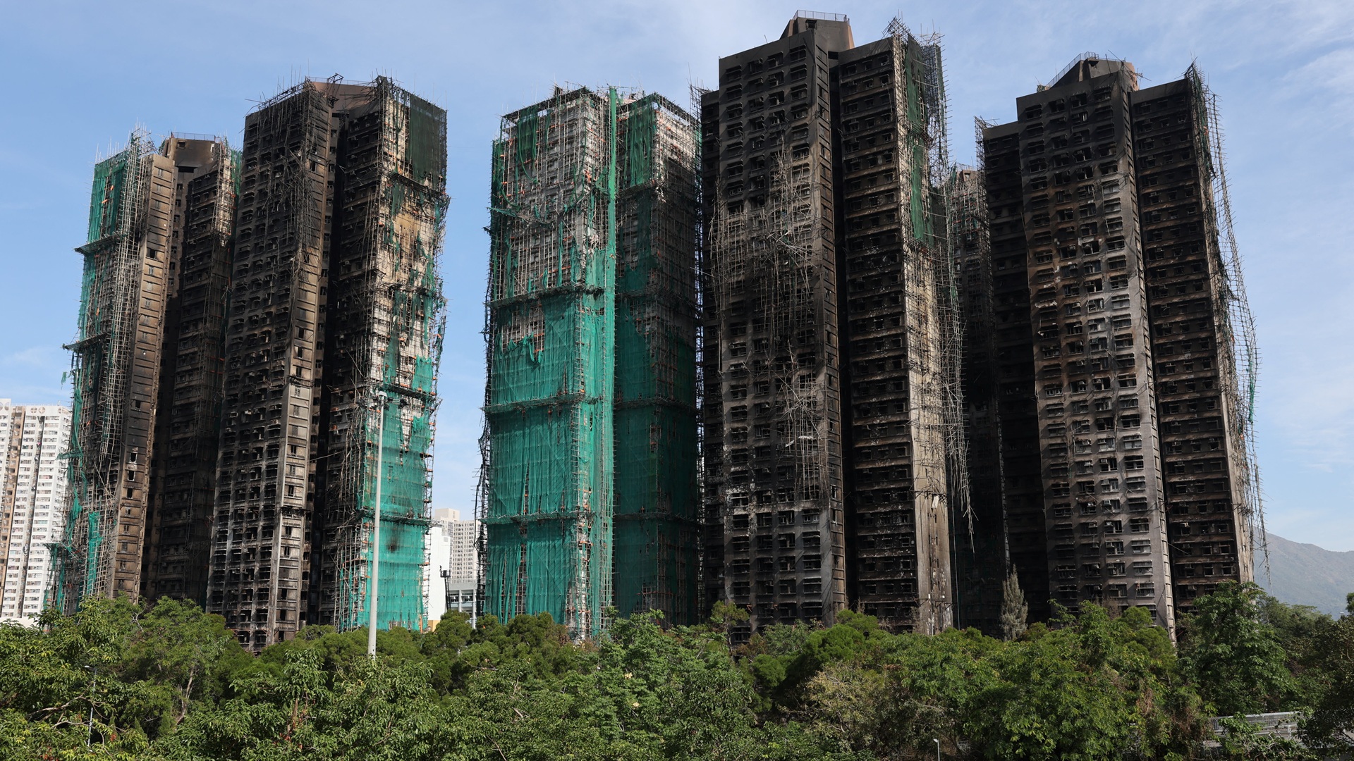 Γύρω από τις πολυκατοικίες είχαν τοποθετηθεί σκαλωσιές από μπαμπού και δίχτυα από πλαστικό για εργασίες ανακαίνισης των κτιρίων, τα οποία είχαν ανεγερθεί τα χρόνια του 1980 και χρειάζονταν επισκευές.