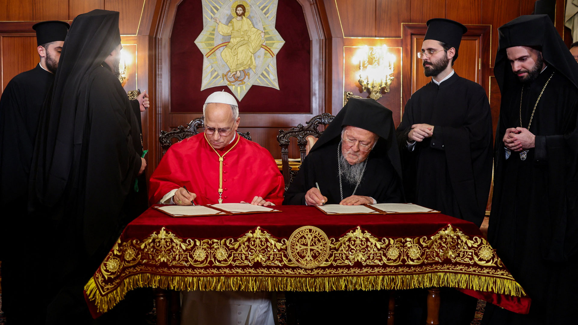 O Οικουμενικός Πατριάρχης Βαρθολομαίος και ο Πάπας Λέων ΙΔ‘ υπέγραψαν σήμερα στο Φανάρι Κοινή Διακήρυξη, επιβεβαιώνοντας τη δέσμευσή τους για την πλήρη κοινωνία και απορρίπτοντας κατηγορηματικά τη χρήση της θρησκείας για την αιτιολόγηση της βίας.