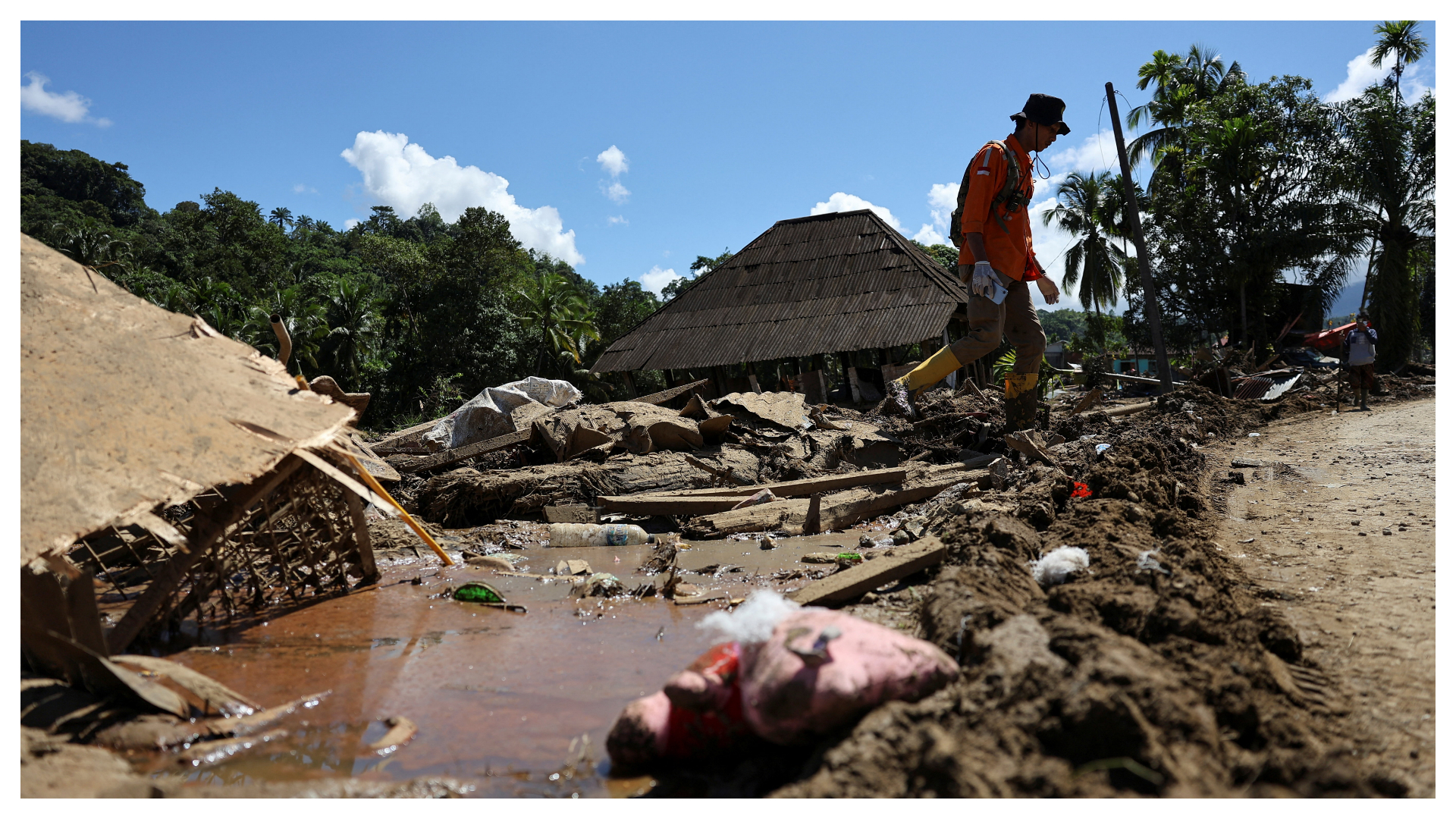 Κάτω από λιακάδα και καθαρό γαλάζιο ουρανό στην πόλη Παλεμπάγιαν στη Δυτική Σουμάτρα της Ινδονησίας, εκατοντάδες άνθρωποι καθάριζαν τη λάσπη, τους πεσμένους κορμούς δέντρων και μπάζα από τους δρόμους καθώς ορισμένοι κάτοικοι προσπαθούσαν να διασώσουν πολύτιμα αντικείμενα όπως έγγραφα και μοτοσικλέτες από τα κατεστραμμένα σπίτια τους.