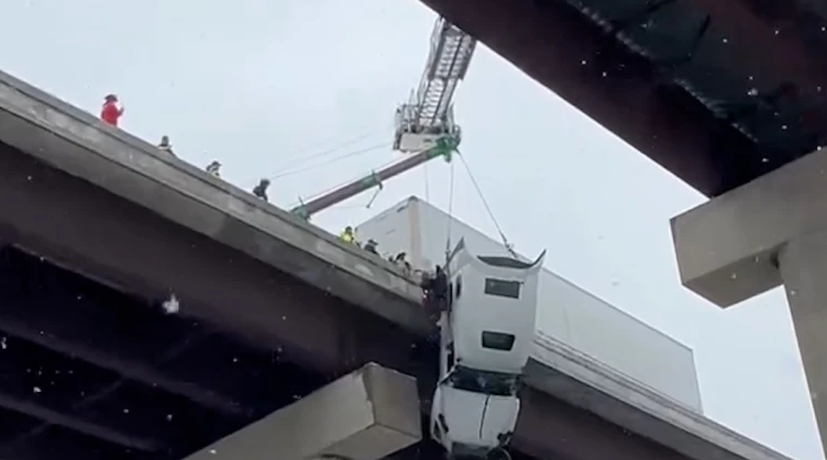 Σε μία δραματική επιχείρηση, οι διασώστες κατάφεραν να απομακρύνουν σώο έναν οδηγό μέσα από την, κρεμασμένη από γέφυρα, καμπίνα του ημιρυμουλκούμενου οχήματός του.