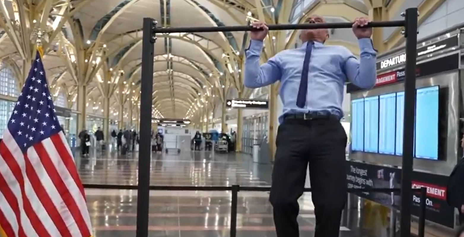Ο υπουργός Μεταφορών, Σον Ντάφι έβγαλε τα παπούτσια και τη γραβάτα του και άρχισε τις έλξεις με φόντο την επιβατική κίνηση στον τερματικό 2 του αεροδρομίου Ρίγκαν, στην Ουάσιγκτον.