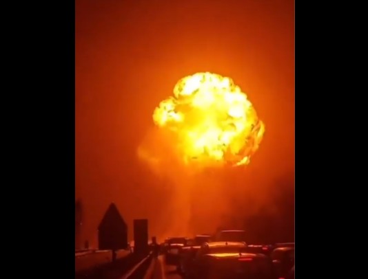 Βίντεο από διερχόμενους οδηγούς δείχνουν ένα τεράστιο μανιτάρι καπνού και τις φλόγες που προκλήθηκαν μετά την έκρηξη.